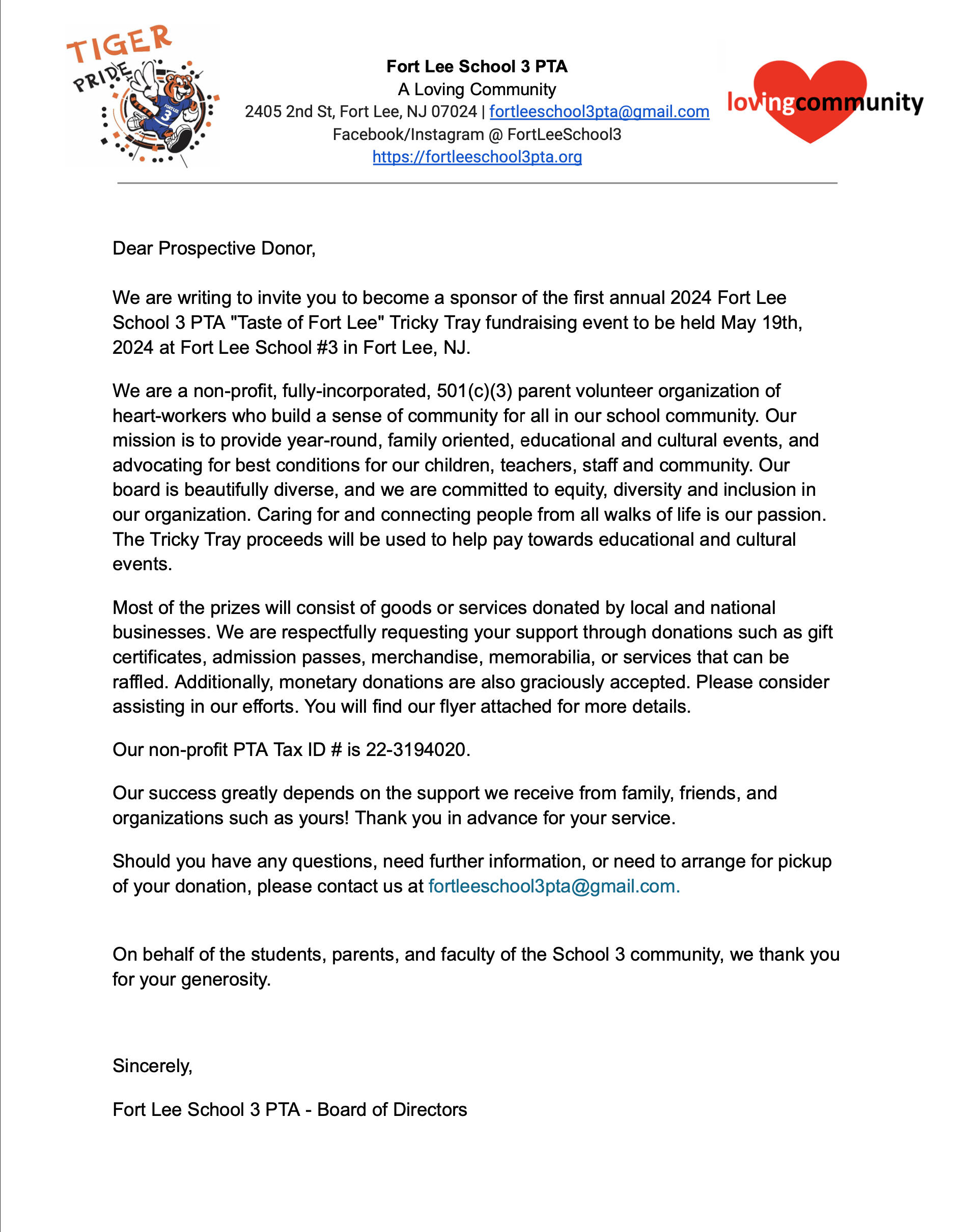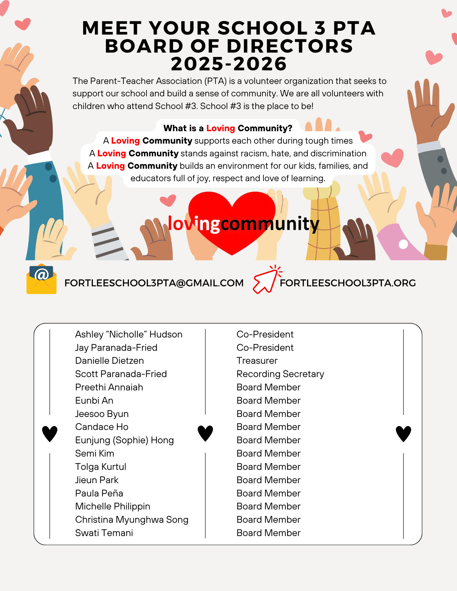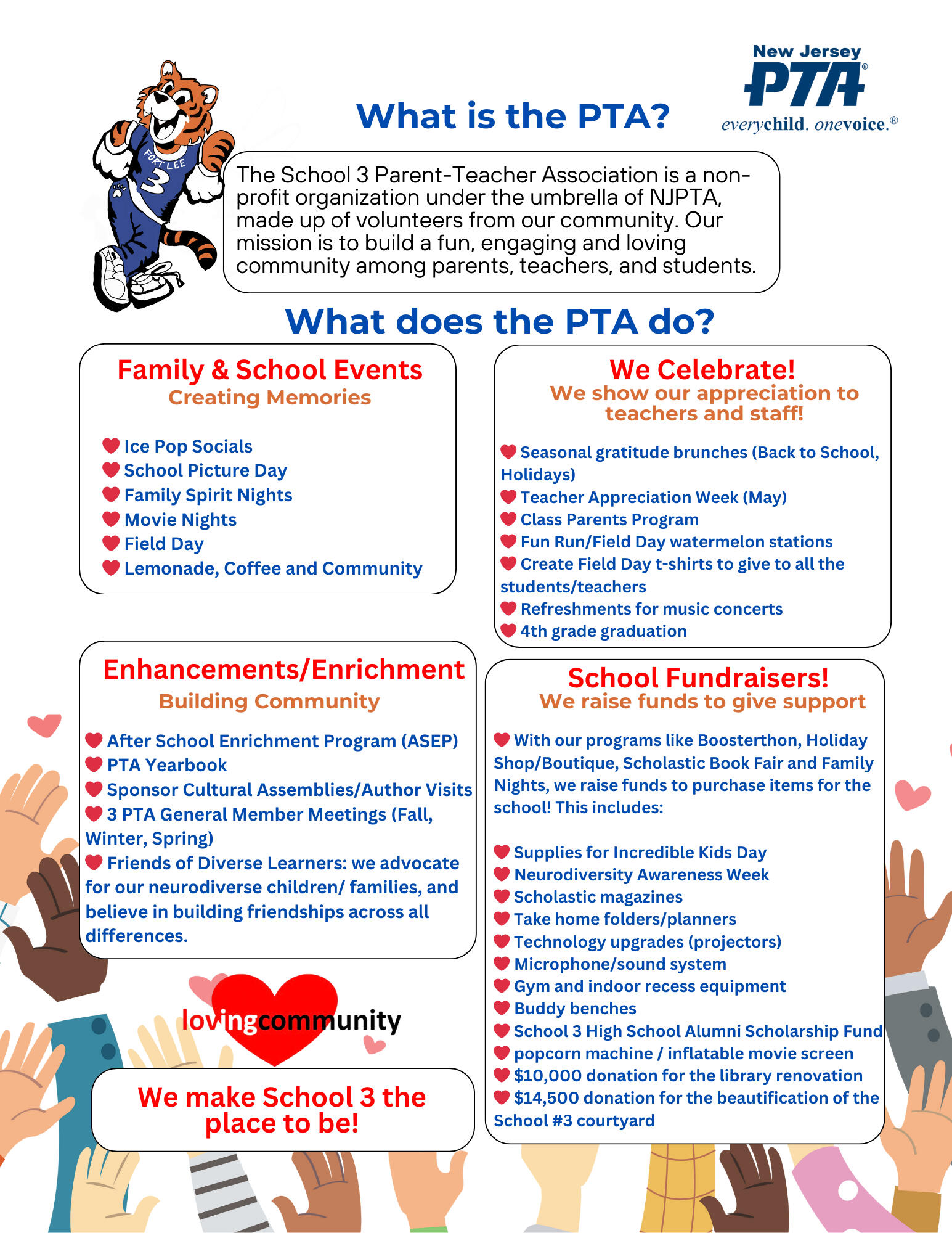 2405 2nd Street, Fort Lee NJ 07024We are a non-profit, fully-incorporated, 501(c)(3) parent volunteer organization of heart-workers who build a sense of community for all in our School 3 neighborhood. Our mission is to provide year-round, family oriented, educational and cultural events, and advocating for best conditions for our children, teachers, staff and community. Our board is beautifully diverse, and we are committed to equity, diversity and inclusion in our organization.Want to contact us? Please email [email protected]! ❤️