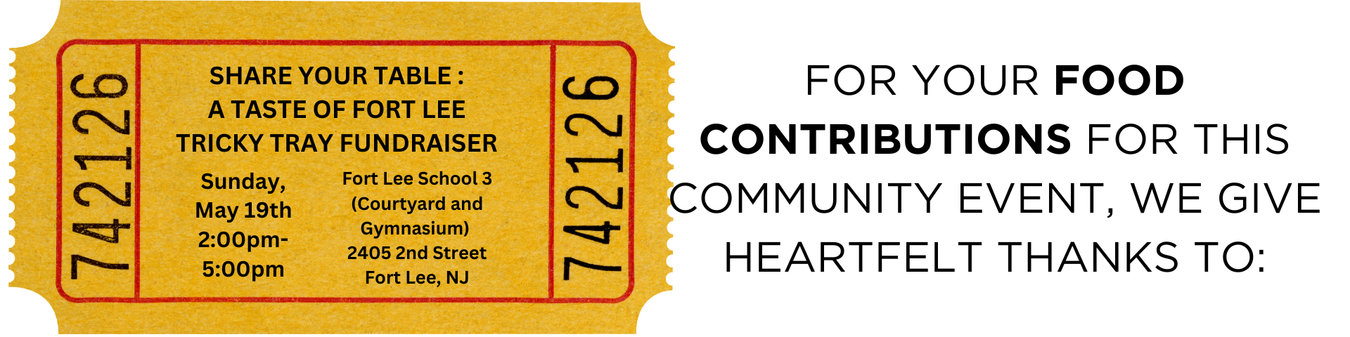 5 Wits - West Nyack, NY ($145 retail value) 5-wits.comACME - Fort Lee, NJ ($50 retail value) acmemarketsfoundation.orgBark Happy ($45 value) barkbox.comBarnes and Noble - Hackensack, NJ ($25 retail value) barnesandnoble.comBergenPAC - Englewood, NJ ($500 retail value)bergenpac.orgBig Kahunas Water Park - West Berlin, NJ ($100 retail value) bigkahunas.comBowler City - Hackensack, NJ ($105 retail value) nationwidebowling.comBritish Swim School - Englewood Cliffs, NJ ($100 retail value) britishswimschool.comCancun Cards - An exclusive 5 day/5 night vacation certificate to stay in Cancun, Mexico. ($795 retail value) cancuncards.comCatch Air - Hasbrouck Heights, NJ ($100 retail value) catchairparty.comChipotle ($25 retail value) chipotle.comChuck E. Cheese ($100 retail value) chuckecheese.comCre8sArt School - Fort Lee, NJ ($325 retail value) www.cre8sart.comCruise Planners ($400 retail value) www.cruiseplanners.comDorney Park + Wildwater Kingdom - Allentown, PA ($140 retail value) dorneypark.comEuropean Wax Center - River Edge, NJ ($80 value) waxcenter.comField Station: Dinosaurs - Leonia, NJ ($80 value) jerseydinos.comFort Lee Pizza - Fort Lee, NJ ($100 retail value) fortleepizzeria.comFranco's Metro - Fort Lee, NJ ($50 retail value) francosmetro.comFun Services - Totowa, NJ ($125 retail value) njfunservices.comGifted and Talented Art Studio - Fort Lee, NJ ($1200 retail value) gntartschool.comGlaze Donuts - Fort Lee, NJ ($570 retail value) glazedonuts.comHabit Burger - River Edge, NJ ($150 retail value) habitburger.comHair Dynamics Salon - Fort Lee, NJ ($75 retail value) hairdynamicsalon.comHigh Exposure Climbing - Northvale, NJ ($60 retail value) highexposureclimbing.com Home Depot ($400 retail value)homedepot.comJJ DAK - Fort Lee, NJ ($300 retail value) jj-dak.comHumdingers - Paramus, NJ ($25 retail value) humdingersnj.comLet’s Roam Scavenger Hunts - ($350 retail value) letsroam.comLiberty Science Center - Jersey City, NJ ($60 retail value) lsc.orgMango Mango Dessert - Livingston, NJ ($75 retail value) mangomangodessert.comManhattan Fencing Center ($1400 retail value) - Englewood, NJ manhattanfencing.comMarty's Burgers - Fort Lee, NJ martysfortlee.comMassage Envy ($105 retail value) - Edgewater, NJ massageenvy.comMassage Envy ($105 retail value) - River Edge, NJ massageenvy.comMicroMagik Englewood Cliffs, NJ ($225 retail value) micromagik.comMonster Mini Golf - Paramus, NJ ($150 retail value) monsterminigolf.comNickelodeon Universe Theme Park (American Dream Mall) - East Rutherford, NJ ($320 retail value) americandream.comNY JETS Memorabilia ($100 retail value)Original Pancake House - Edgewater, NJ ($50 retail value) ophedgewater.comPingPod - Fort Lee, NJ ($300 retail value) pingpod.comPink Nails Too - Fort Lee, NJPoppablesByVee - Fort Lee, NJ ($75 retail value) FB/Instagram @poppablesbyveeSchool 3 PTA - After School Enrichment Program - Fort Lee, NJ ($400 retail value)Scholastic Books ($50 retail value) scholastic.comShopRite Hackensack, NJ ($200 retail value) shoprite.comSojo Spa - Edgewater, NJ ($250 retail value) sojospaclub.comSource Dance Lab - Palisades Park, NJ thesourcedancelab.comSplash Poke - Fort Lee, NJ splashpokebowl.comTac Ops Laser Tag ($60 retail value)
