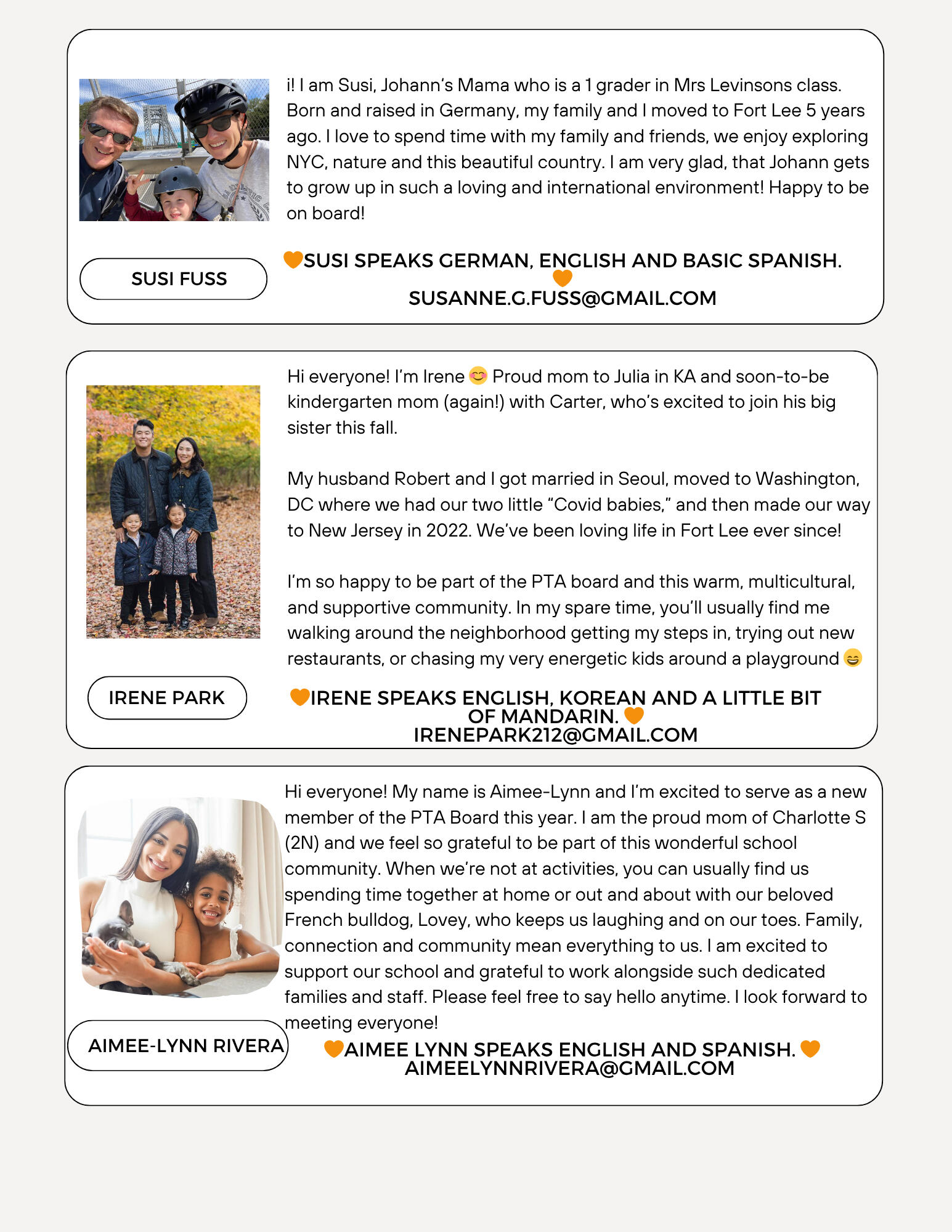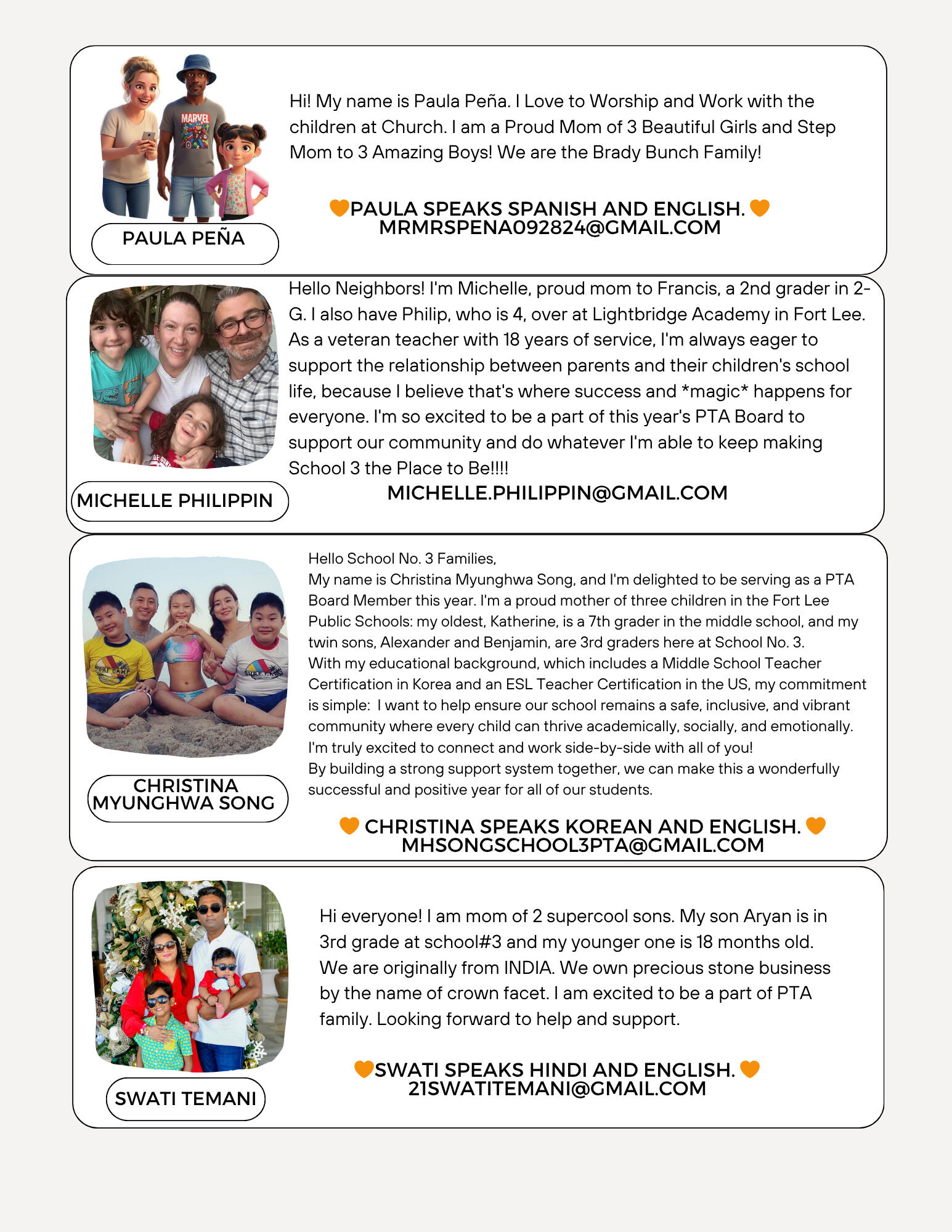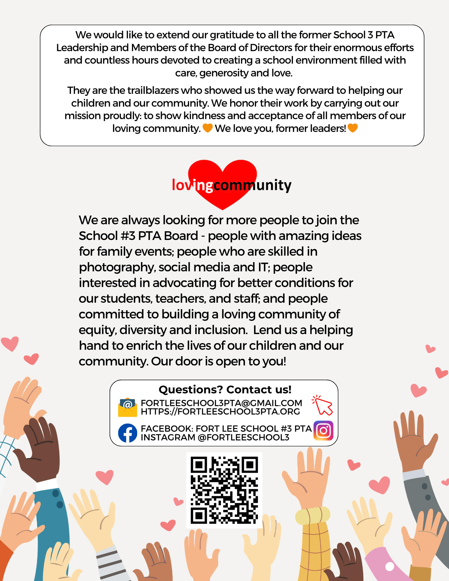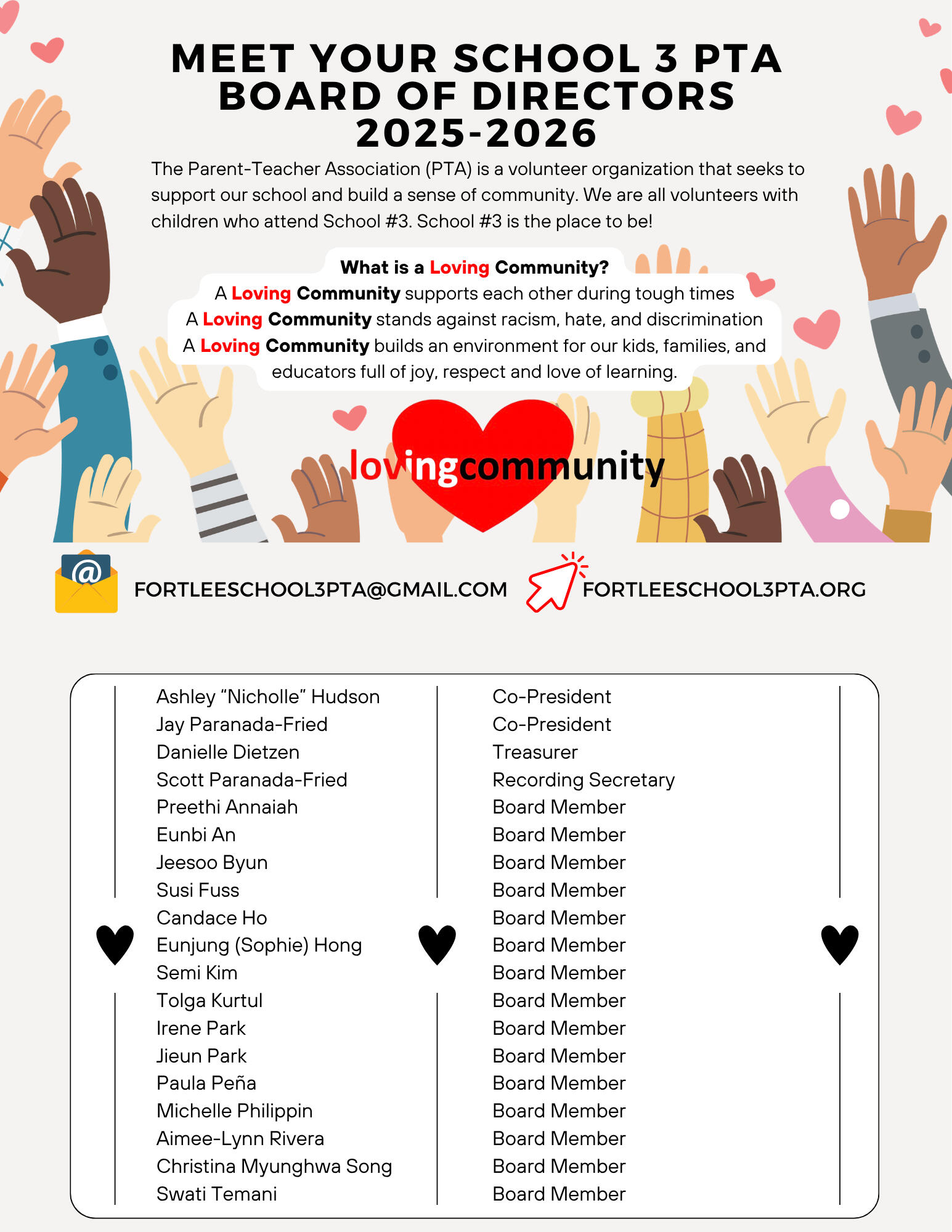 2405 2nd Street, Fort Lee NJ 07024We are a non-profit, fully-incorporated, 501(c)(3) parent volunteer organization of heart-workers who build a sense of community for all in our School 3 neighborhood. Our mission is to provide year-round, family oriented, educational and cultural events, and advocating for best conditions for our children, teachers, staff and community. Our board is beautifully diverse, and we are committed to equity, diversity and inclusion in our organization.Want to contact us? Please email [email protected]! ❤️